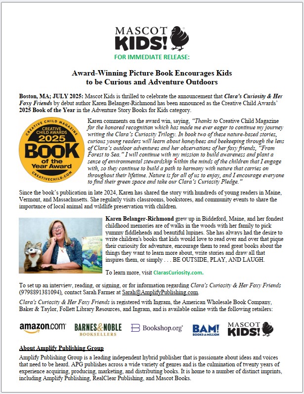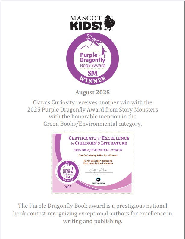 “‘Clara’s Curiosity & Her Foxy Friends by Karen Belanger-Richmond is a heartwarming tale that invites young readers into the vibrant natural world through the eyes of Clara, a young girl with a boundless zest for discovery. This book, ideal for children aged four to eight, begins with Clara’s enchanting encounter with a family of Maine gray foxes right outside her window. As Clara ventures into the forest to observe these creatures, readers embark on an engaging journey highlighting the beauty and mysteries of wildlife. A unique aspect of the story is its interactive component. It encourages young readers to write, draw, and share their adventures on the book’s companion website, providing creativity and engagement beyond the pages. This feature inspires young readers to observe and explore their environments.